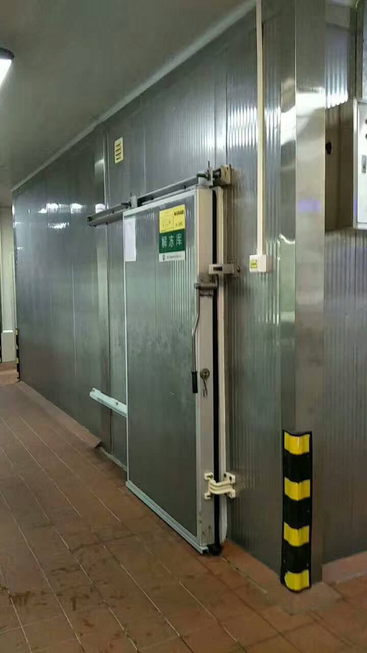 冷庫工程名稱: 湛江市金小小食品有限公司面包速凍冷庫 冷庫概況: 該速凍庫由廣州利鳴機械科技有限公司承建,冷庫庫容為30立方,儲藏產品:面包 產品尺寸:10cm*60cm*8cm,產品進庫溫度:常溫,冷庫速凍時間:90分鐘; 速凍后的產品中心溫度:-18度。 庫體采用雙面不銹鋼15cm聚氨酯冷庫板,機組采用北京比澤爾20匹雙級水冷機組, 冷風機采用高翔定制型DJ140水沖霜不銹鋼冷風機